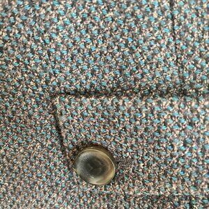 A beautiful Mexx Metropolitan tweed cropped blazer in brown with teal accents. In great used condition with some wear on the arm pits.