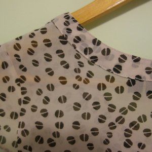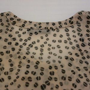 Vintage Mexx short sleeve blouse. Light pink colour with a coffee bean graphic pattern. Really cute cap sleeves and ruffle detail in the front. Flowy, light, and wrinkle-free material. US Size XS (or UK Size 6).