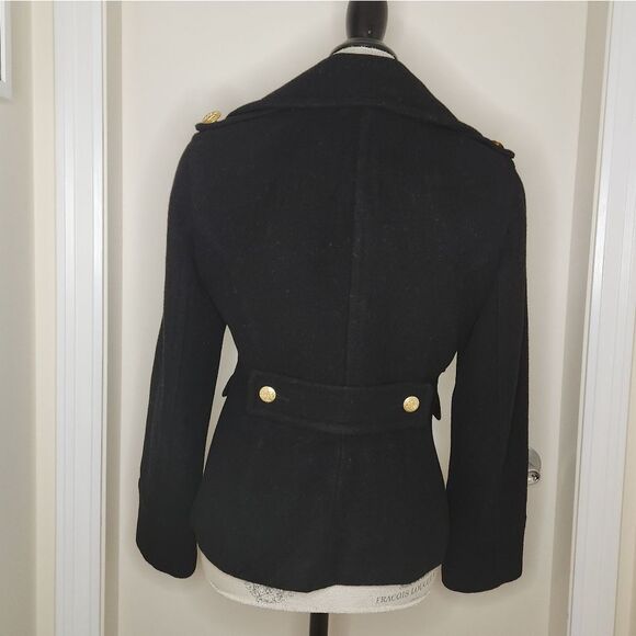 Black double breasted classic sailor style notched collar pea coat with gold embossed military buttons and flap side pockets, by Michael Michael Kors.
