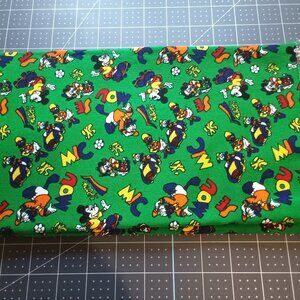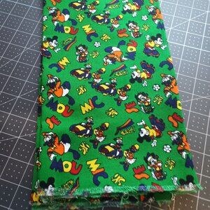 How fun is this design featuring the images of Mickey Mouse and Donald Duck in sports activities? The fabric is new, unused, and appears to be vintage. It is a heavy cotton with designs in multi colors such as orange and green on a solid green background.