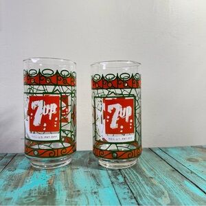 These vintage 7up glasses feature the iconic Lady in Swimsuit design with a unique stained glass pattern. The colors of red, green and white add a pop of vibrancy to any collection. With its advertising theme of soda, this glass is a must-have for any 7up or soda enthusiast. Perfect for display or use, this collectible item is a great addition to your home or office.