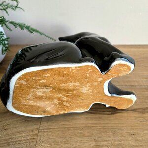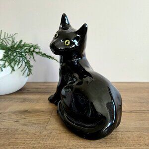 Vintage Mid Century Modern ceramic black cat sculpture with glass green eyes.