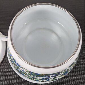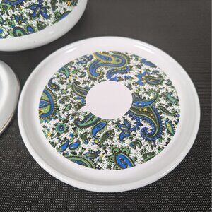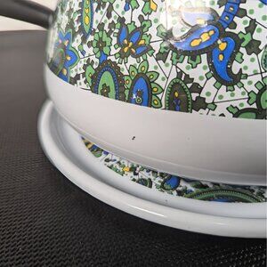 Vintage Mid Century White Enamel Green Paisley Fondue Pot & Tray
