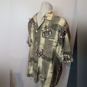 Pristine Vintage Tropicana Traditional Button Front Shirt. Approximately mens Large. Made in Hawaii. 100% Rayon Shirt. This fabulous Hand-Printed Shirt features an abstract Kingdom of Hawaii Coat of Arms. The Royal Crest is still used today in the State of Hawaii Crest. Colors include Greens, Brown and White. With shades of orange and pink. This shirt has a 'Kama'aina Style' Envelope/Slash pocket. Large Fold over Collar with Hidden Stitching. 4 Button Front. Plenty of Selvage. Beautifully Designed, These shirts were made to last for generations. This Shirt is excellent Vintage Condition with no signs of wear Aloha Shirts are the History and Culture of Hawaii on Fabric. The Hawaiian Shirts are 'Wearable Art'.