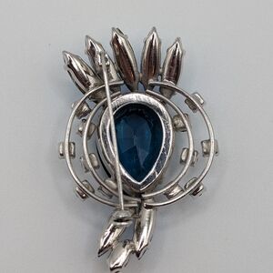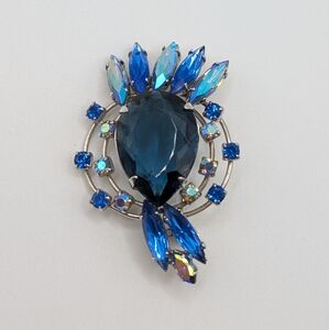 This stunning vintage brooch features a dramatic pear-shaped sapphire blue rhinestone at the center, accented with marquise-cut aurora borealis stones and brilliant sapphire chatons. The layered silvertone setting adds depth and sparkle, making this piece a true statement accessory.