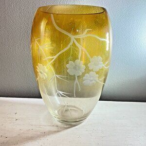 Vintage Mid-Century Etched Amber Glass Vase 8” Tall with Floral & Wheat Pattern