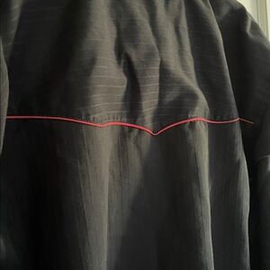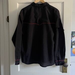 Black with a subtle pinstripe and then stunning roses embroideries on bothered sides of the chest. The red piping with the snap buttons adds the perfect western details