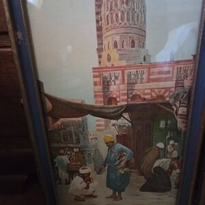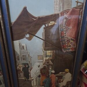 Pair of framed wall art depicting a Middle Eastern market scene. Features vibrant colors and intricate details.