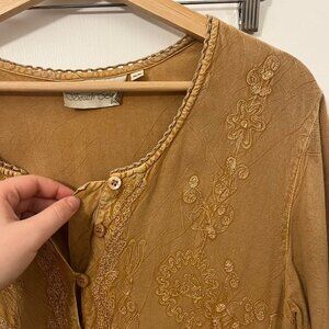 Yellow-ish tan midi dress, with embroidered button-up upper body. Thrifted.