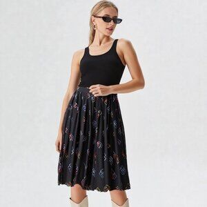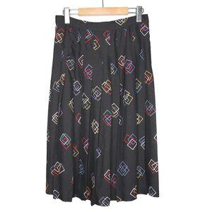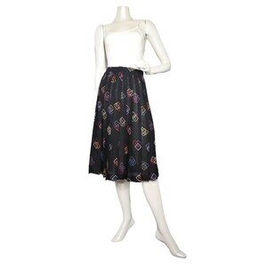 Vintage Midi Pleated Skirt Boho Retro Geo Pattern Summer Black Geek Secretary