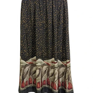 Embrace the wild with this vintage midi skirt in a bold giraffe and safari print. The elastic waistband ensures a comfortable and flattering fit, while the lightweight and unlined polyester material allows for easy movement. Perfect for a casual occasion, this straight and pencil style skirt is a unique addition to any wardrobe. The olive green color and multicolor pattern make this skirt a standout piece, and the high rise adds a touch of sophistication. Whether you're going on a jungle adventure or just running errands, this skirt is the perfect choice. Get ready to turn heads with this exotic piece from the 80s and 90s.
