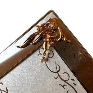 Silver-tone metal frame with a gold-tone floral design with a pearl drop.