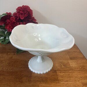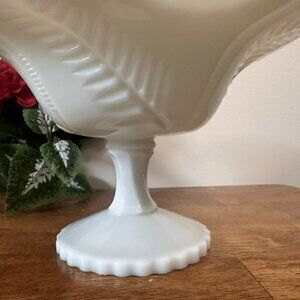 This beautiful vintage milk glass compote dish features an elegant pedestal design and a delicate leaf or fern motif encircling the bowl. With its generous size and timeless style, it's a perfect blend of beauty and function—ideal for weddings, special events, or everyday vintage charm.