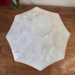 Vintage Milk‎ Glass Covered Candy Dish Grape Vine Embossed Footed Jar Octagonal