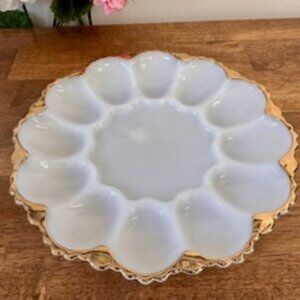 Vintage Milk Glass Deviled Egg Tray with Gold Trim Scalloped Edge Serving Plate