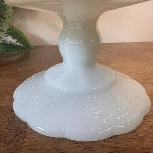 The textured grape and leaf design adds dimension, while the crisp white milk glass gives it timeless appeal. These classic pieces remain highly collectible and versatile for display or use in both retro and modern spaces.