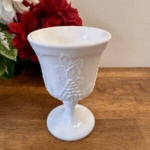 This elegant vintage milk glass pedestal dish features a raised grape and leaf harvest motif, beautifully cast in a glowing white finish. Likely made by Indiana Glass or a similar mid-century American maker, this charming piece is perfect for adding a classic cottage or farmhouse touch to any table.