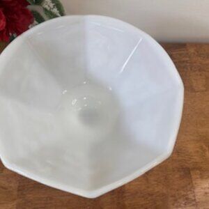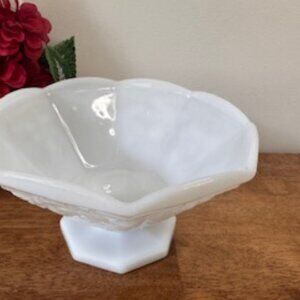 This striking vintage milk glass pedestal bowl features an embossed grapevine and fruit motif around the body, a beautifully scalloped rim, and an octagonal base. With its dramatic flared silhouette and crisp white finish, it’s a standout piece for display or serving. The combination of its intricate design and substantial size makes it ideal for use as a fruit bowl, floral centerpiece, or collector's display.