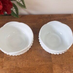 These charming vintage milk glass planters feature a classic diamond point hobstar-style pattern and stand elegantly on three rounded feet. Their scalloped rims add a lovely decorative touch, perfect for lovers of vintage décor or collectors of milk glass.