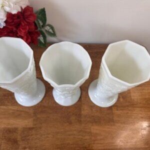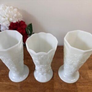 This elegant set of three vintage milk glass vases showcases the timeless grapevine and floral relief pattern popular in early American pressed glass. Each vase features beautiful raised detailing, scalloped or octagonal rims, and a pedestal base, creating a graceful silhouette ideal for display or use.