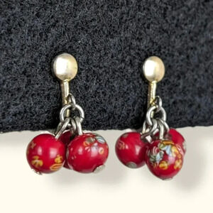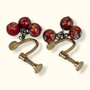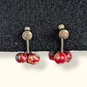 These vintage earrings made of a gold tone metal and have very sturdy screw back closures. The earrings each feature 3 very small dangling glass ball beads that have tiny little colourful floral ("Millefiori") patterns. The earrings are in good condition overall but the gold tone is rubbing off in some places from wear. See the 2nd last picture to see where it is most "severe" .