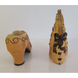 Vintage miniature Nostalgia ceramic/resin ladies handbag and shoe decorative figurines, approx 3'x2' the handbag, and 3x2.5 the shoe.
