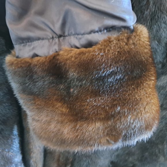 A vintage fur coat (I believe US size 14) that I have been told is mink. The fur is a very dark brown -almost black in some lighting- and the inside lining is of a purple hue. The coat has 4 buttons that tie into loops and 1 pocket on either side. The stitching looks good.