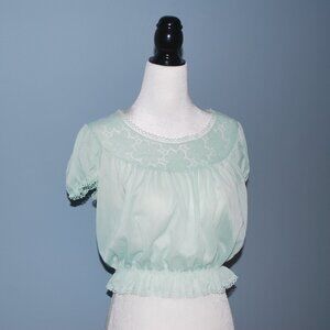 Cropped mint green princess-style top :) This charming and feminine garment is designed in a soft, light teal hue and features a cropped length, ending just above the waist