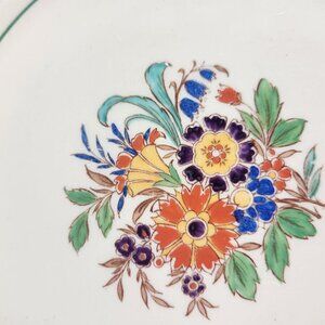 Multi-coloured plates have a green ring around the edge and in the center with floral swags in purple, red, orange and blue and around the edge and a cluster of flowers in the center. Very pretty.