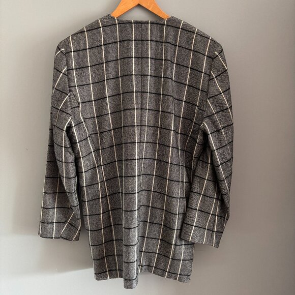 This beautiful lightweight wool blazer in black and off white-cream plaid comes fully lined with 2 front pockets, and no front closure making it ideal for various layering looks!