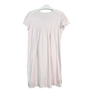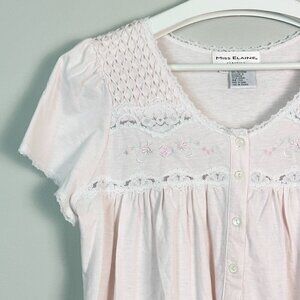 Vintage Miss Elaine Cotton Blend Lace & Embroidered Detail Nightgown. Light pink short sleeve nightgown. Lace trim on sleeves, neckline, and across front. Embroidered flowers across front. Button down top half. Hits just below the knee. Materials: 60% Cotton, 40% Polyester. No known flaws.