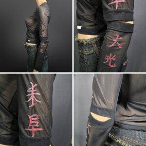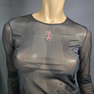 Vintage Miss Sixty Black Sheer Long Sleeve Top Size M Asian Print Grunge Punk