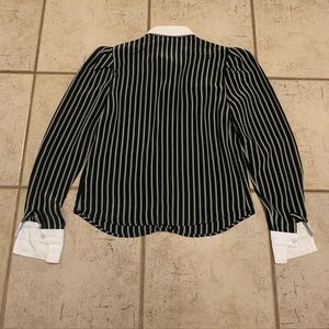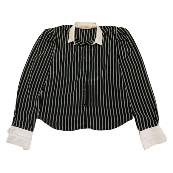 The blouse features a bold black and white pinstripe pattern with contrasting crisp white cuffs and a classic Peter Pan collar. The fabric has a light and airy feel, ideal for a refined business-casual look. The oversized, relaxed fit with subtle pleating at the shoulders and the blouson sleeves are all hallmarks of classic 1980s fashion.