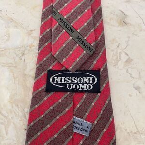 In very good preowned condition vintage 100% silk Missoni tie, purchased at Holt Renfrew, made in Spain. Classic diagonal stripes in cool red and grey tones.