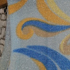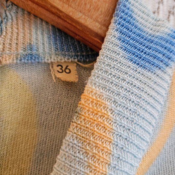 The colours are very nice with the blues, yellows and a smattering of light orange. It has a nice sheen to it. The size is a 36 (Ladies S). There are no holes or snags in the piece at all.