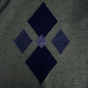 Heathered green sweater featuring a blue diamond pattern on the front. Center diamond is stitched on, feels like a faux suede.