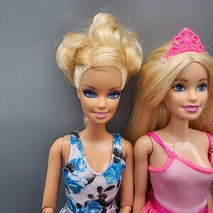 Condition: Pre-owned, varying condition. Some wear on clothes, minor marks, scuffs, and play wear. Pink lace skirt has writing, and one doll has ink marks on the hands (see photos). Great for play or collecting!