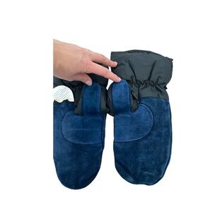 DESCRIPTION: Awesome vintage, Never used, Snowmobile/& or Winter Outdoor Activity Gloves. Elastic at wrist. Lightweight. Black front with blue leather palms. Would make a great gift for any outdoor enthusiast!