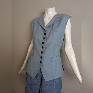 Chic and tailored vintage wool vest by Mondi made in Germany. Soft blue wool with a structured silhouette, deep V cut, and 8-button front closure. Features an adjustable tie at the back for a customized fit. Size 38 (German), fits like US 6/8.