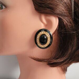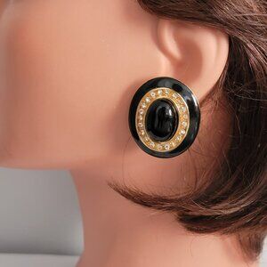 These are lovely vintage Monet clip-on earrings. They are oval-shaped with a black glass cabochon center, a ring of clear rhinestones and an outer rim of black enamel. The Monet maker mark is on the clip. Slightly on the heavier side, 14 grams each.