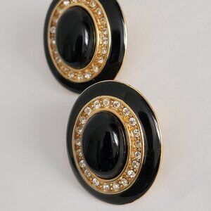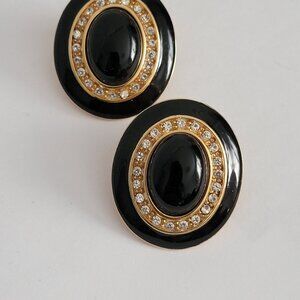 Vintage Monet Oval Black Enamel Clear Rhinestone Clip On Earrings