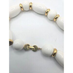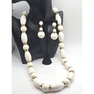 Stunning White and Gold Monet Milk Glass Demi Parure with round white clip dangling earrings 2 " and a long white glass and gold color necklace of 28 inches. All signed Monet. In good condition.