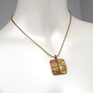 Vintage Monet Signed Square Iridescent Pendant Necklace Gold Crackle Rope Yellow