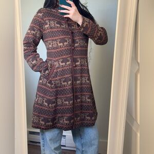 Embrace timeless style with this vintage longline jacket, featuring a captivating moose print that adds a touch of rustic charm. The rich brown earthy color, complemented by intricate geometric patterns, makes this jacket a standout piece in any wardrobe.