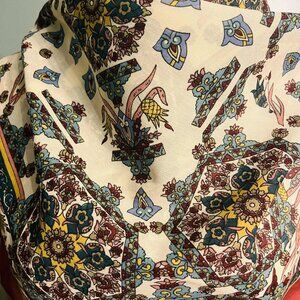 Scarves with authentic mosaic-inspired prints from this era are becoming increasingly rare. This piece stands out for its bold composition, rich palette, and cultural artistry — a true gem for vintage enthusiasts.