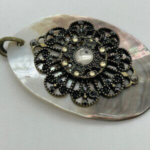 Elegant, vintage artisanal Mother of Pearl oval pendant. Its multifaceted beaded design exudes a timeless charm that complements any outfit, making it a versatile addition to your jewelry collection. Measures 2 1/2" X 1 3/4"