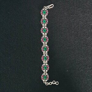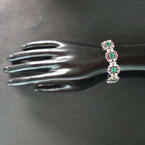 Vintage Mughal Revival 925 Silver Genuine Ruby & Green Crystal Floral Bracelet