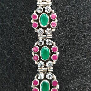 This stunning piece features eight ornate floral links (each 18mm x 15mm), adorned with genuine rubies, green crystals, and sparkling white CZ stones—a vibrant harmony of color and craftsmanship. The intricate silverwork reflects the opulence of traditional Mughal jewelry, known for its balance, symmetry, and regal flair.