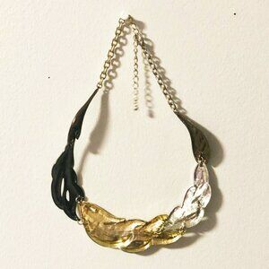 Vintage-inspired statement necklace with a mixed-toned intricate feather patterns in gold, silver, and bronze. Worn a few times but still in great shape.