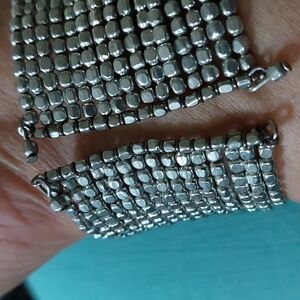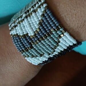 This cuff is from the 90s. Handmade with blue, white, gray and bronze colour beading. Snaps gentally onto wrist. Comfortable to wear.